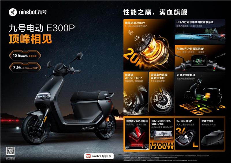 九號電動E300P可謂是全場焦點般的存在,作為一款主打高性能的智能電摩,實現了可搭載三塊電池的新突破,整車的性能和續航都有一個大幅度的提升:峰值功率為20kW,最 高速度可達135km/h,0-100km/h加速時間可達7.9s,以強勁的性能,刷新世人對性能的看法。