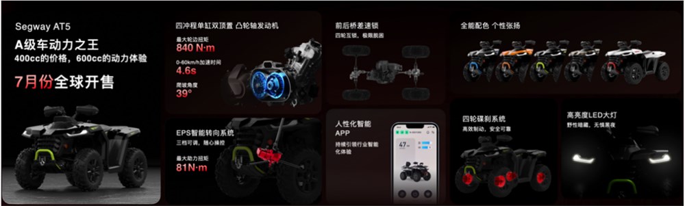 這款被譽為“A級車動力王”的 Segway AT5 全地形車,在發布會上大放異彩。它擁有強勁的動力和卓越的配置,600cc的動力搭配400cc的售價,為駕車者帶來了更加震撼的越野感和更具心動的價格。Segway AT5 采用的是全自主研發的四沖程單缸雙頂置凸輪軸發動機,其最 高速度為100km/h,最 大車輪轉矩為840N·m,0-60km/h的加速時間只需要4. 6 秒,這樣強勁的動力性能使得它的駕駛員能夠在任何復雜的地形中暢通無阻。
